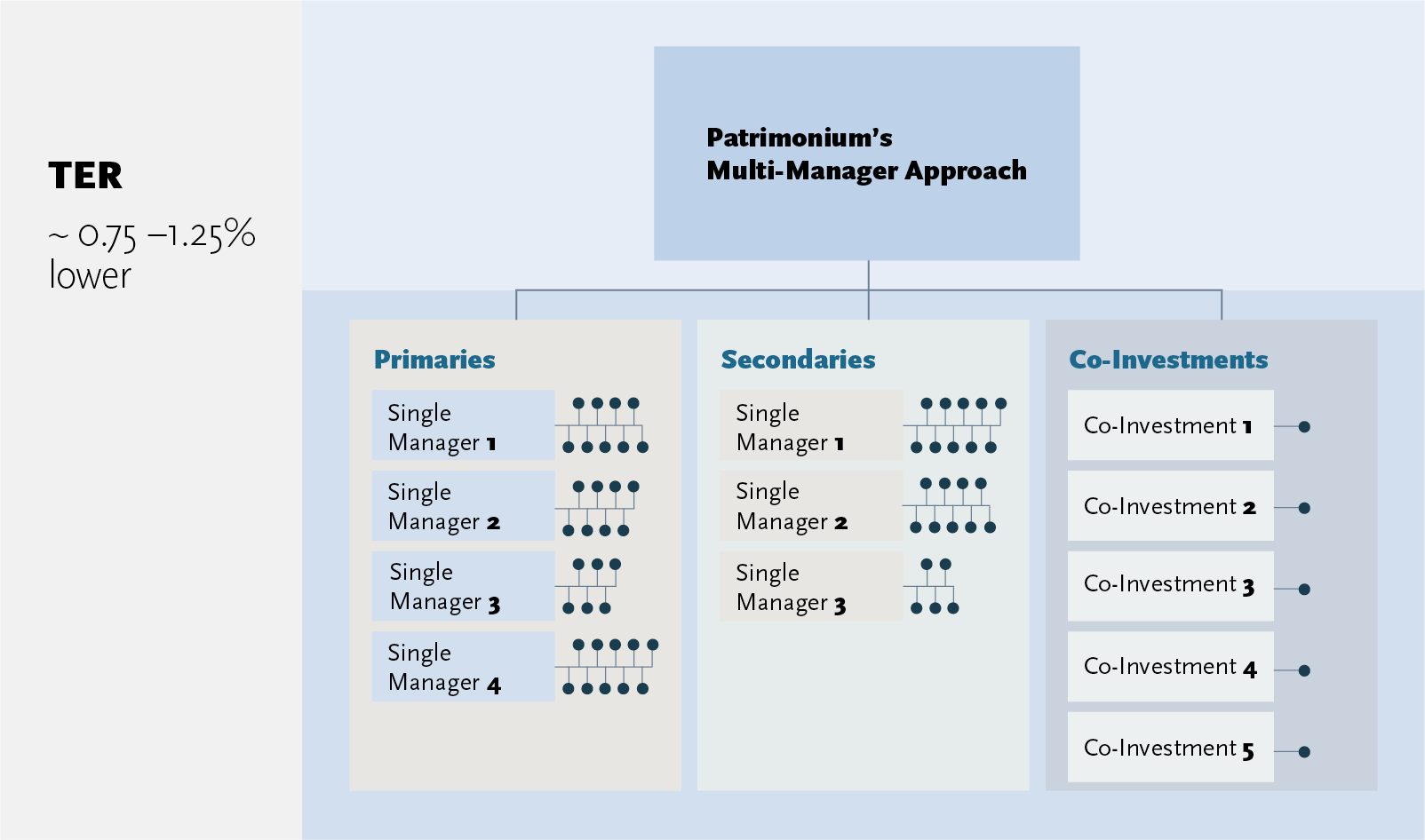 Patrimonium setzt Investitionen in Infrastrukturanlagen effizient um, indem Primaries, Secondaries und Co-Investitionen zielgerichtet kombiniert werden. Der Schwerpunkt liegt dabei auf Co-Investitionen und Secondaries, was erfahrungsgemäss eine Reduktion der Gesamtkosten um etwa 0.75% bis 1.25% ermöglicht. Co-Investitionen können häufig gebührenfrei oder mit deutlich reduzierten Gebühren umgesetzt werden. Bei Secondaries werden zukünftige Gebührenansprüche oft ganz oder teilweise über den Kaufpreis diskontiert.